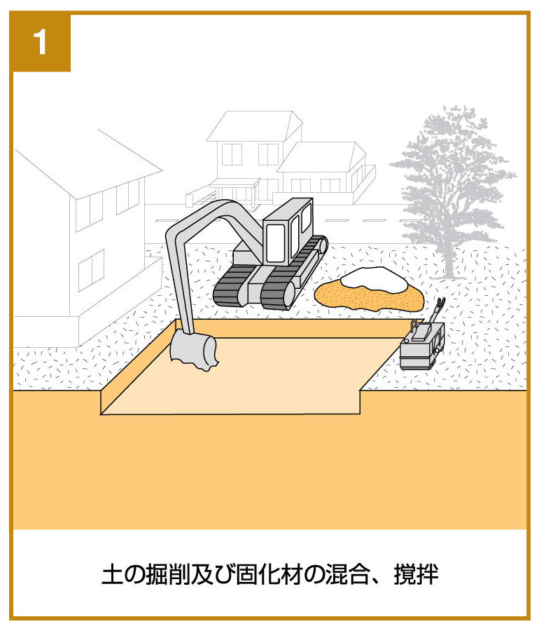| 建設予定地の土を掘り起こし、セメント系の固化材を土と混ぜ強固な地盤にします。公共施設や道路工事などにも多く使われている信頼性の高い汎用的な工法です。比較的浅い深度において、軟弱層やバラツキのある地層に効果的な工法です。 |