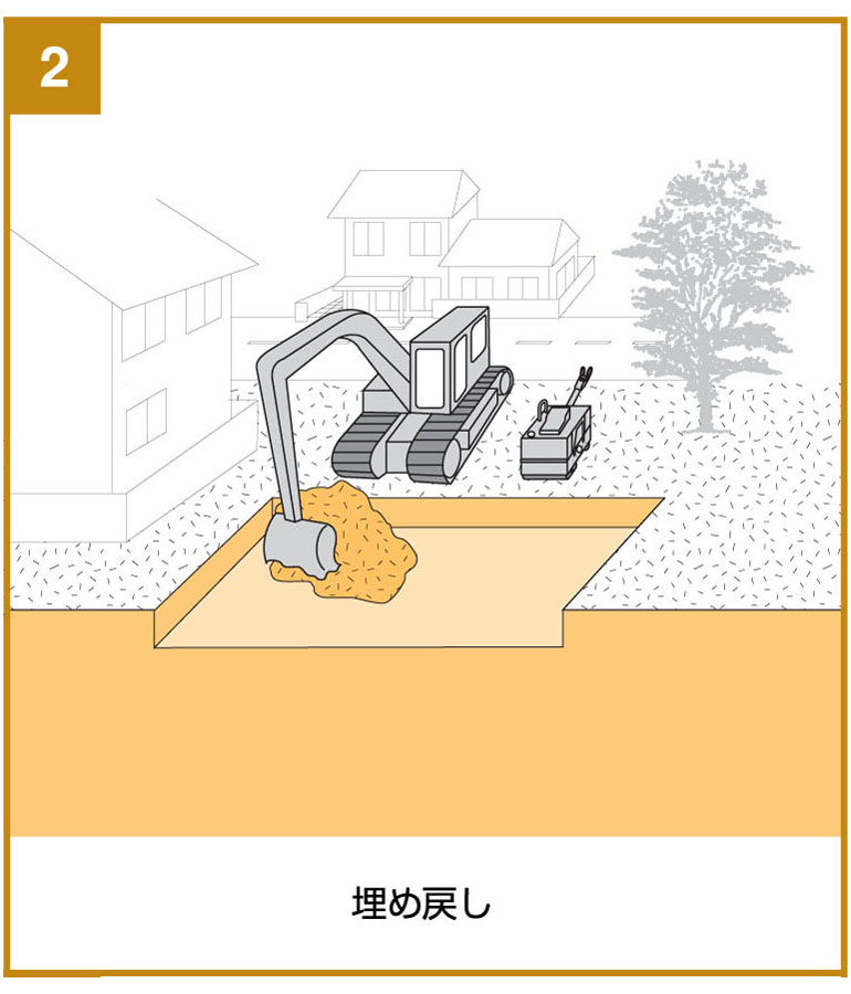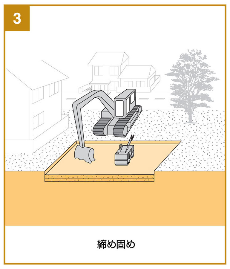 | 【表層改良】 比較的浅い深度に硬い地盤が存在する場合、もっとも理想的な対策は、表層地盤改良工事です。表層において地耐力にばらつきのある地盤や軟弱な地盤に効果的。建設予定地を掘り起こし、その土に固化剤を混ぜ攪拌。さらに、ローラーによって圧力をかけ均一化し、支持力をアップします。 |