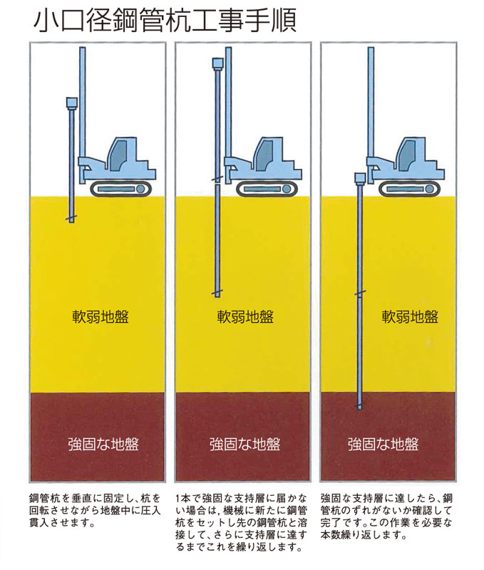 | 地盤条件の制約とその土地の制約を殆ど受けない工法です。騒音・振動等が少なく、宅地の地盤改良に最も適した工法です。JIS規格に適合した鋼管杭を、軟弱地盤の下位にある固い支持地盤まで、回転注入する事により建築物の基礎にかかる荷重を支持地盤まで伝達して、建築物を長期間にわたって安定させます。肉厚鋼管杭を打ち込むので優れた耐久性を持っており残土処理が不要です。 |